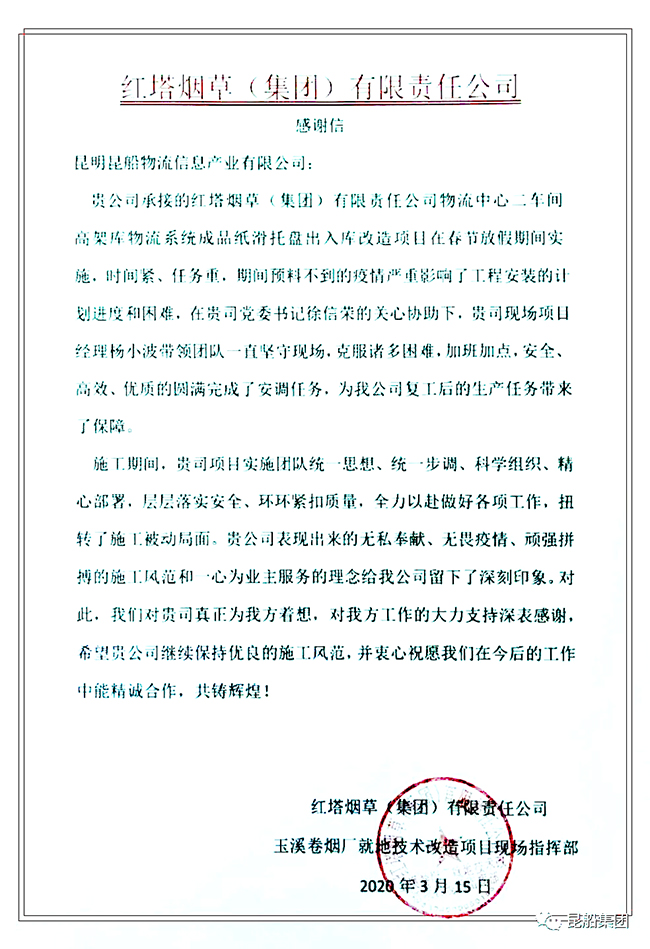 困難面前不畏艱險,疫情面前逆行而上,物流公司實施團隊用他們的無私奉獻,為昆船物流再一次樹立了口碑,爭取了榮譽,公司發展過程中,用戶的認可是的必不可少的條件,公司全體職工將努力向優秀的團隊和職工學習,全力以赴為公司高質量發展做出貢獻。 |